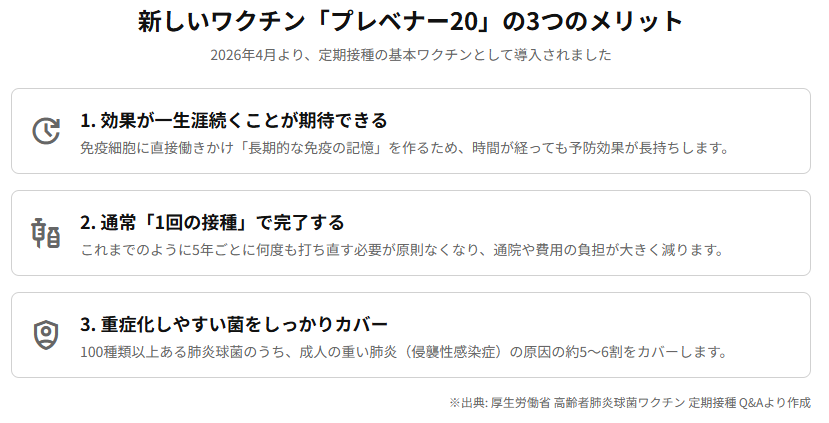 【2026年4月】65歳以上の肺炎球菌ワクチンが「プレベナー20」へ!以前打った方の注意点や新しい制度の違いをわかりやすく解説