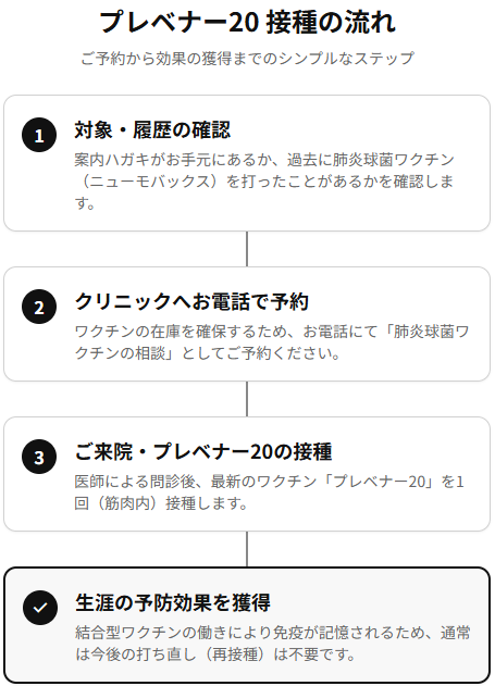 20種類の菌に対応する新しい作りのワクチンです。100種類以上ある肺炎球菌の中でも、特に重症化しやすい20種類をターゲットにしており、重い肺炎の原因の約5〜6割をしっかりカバーします。