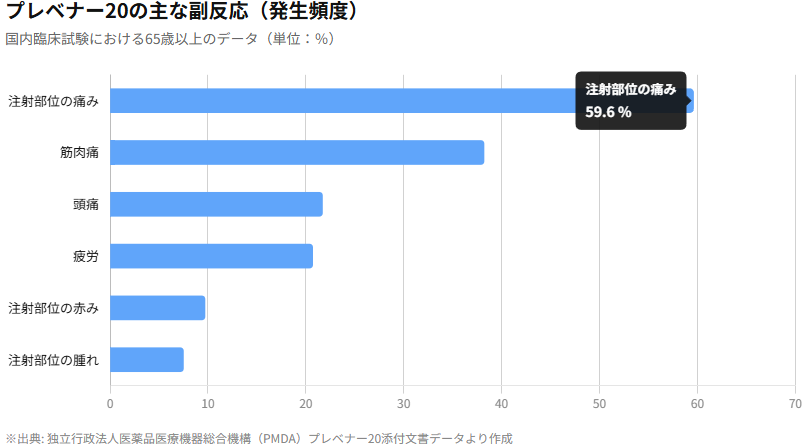 厚生労働省のデータ(国内の臨床試験)によると、プレベナー20の接種後には以下のような副反応が報告されています。